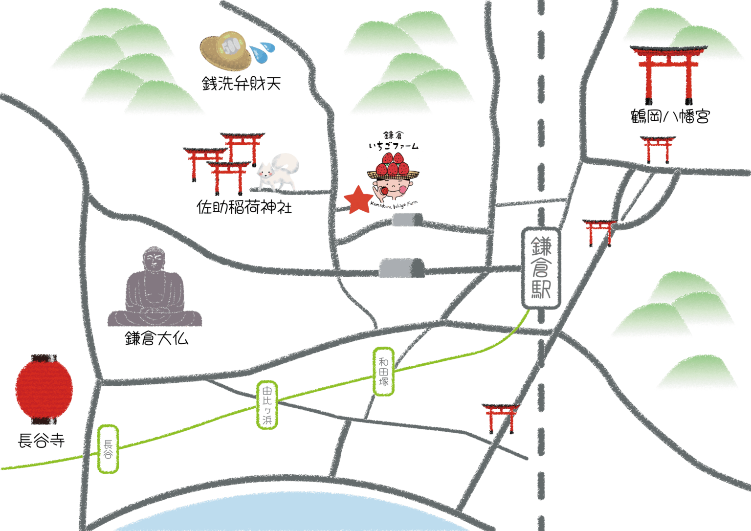当園は、鎌倉駅から車で約13分の好立地にあり、観光といちご狩りを一日で楽しむことができます。周辺には「銭洗弁財天」や「佐助稲荷神社」などのパワースポット、鎌倉ならではの古民家カフェや由比ヶ浜エリアの散策スポットも多数。観光で歩き疲れたら、当園の甘くてジューシーないちごでリフレッシュするのもおすすめです!